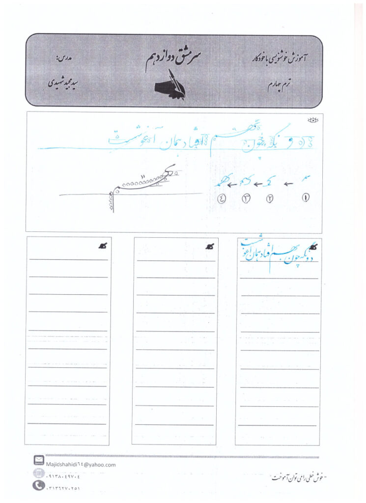 آموزش خط خودکاری،نستعلیق،شکسته نستعلیق، نسخ و انگلیسی این دوره ها برای تمامی سنین طراحی شده و از سنین 9 سال تا 90 سال قادر به فراگیری اصول خوشنویسی خواهند بود. دوره های آموزش خط خودکاری در اصفهان شامل نستعلیق، شکسته نستعلیق، خط نسخ ، و لاتین یا همان خوشنویسی انگلیسی می باشد. خط تحریری نیز در ابتدای تمامی دوره ها به هنرجویان خوشنویسی آموزش داده می شود. تخصص ما دوره های خوشنویسی و اصلاح دستخط با استفاده از خودکار و مداد است و خوشنویسی با قلم نی آموزش نمی دهیم.ساعات آموزش خوشنویسی عصرها در محل دفتر و صبح ها در محل هنرجو بنا به تقاضای هنرجویان می باشد . نگران شرایط کلاسهای خوشنویسی در اصفهان نباشید چرا که متناسب با شرایط شما برگزار می شود.بسته آموزشی خوشنویسی شامل سرمشق های نستعلیق، شکسته نستعلیق، خوشنویسی انگلیسی و خط نسخ بسته به هر ترم به هنرجو داده می شود .علاوه بر آن لازم است که هر فرد یک عدد دفتر خط دار و خودکار یا مداد معمولی نیز به همراه داشته باشد. هر ترم خوشنویسی با خودکار 12 جلسه بوده و فیلم آموزشی خوشنویسی با خودکار نیز بنا بر لزوم به نمایش گذاشته می شود.