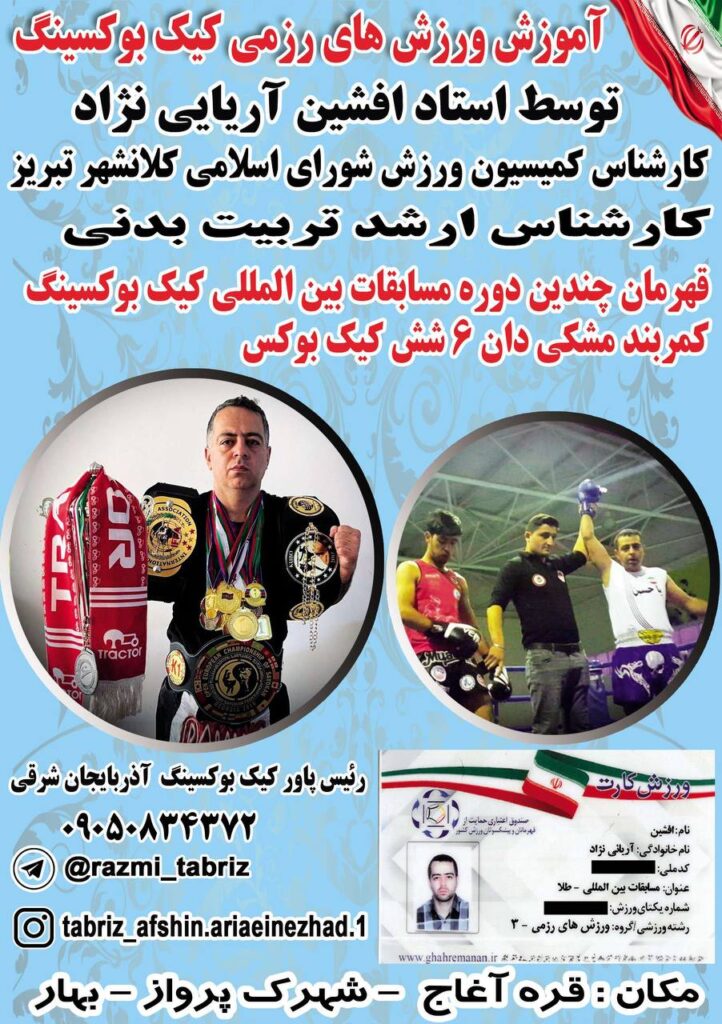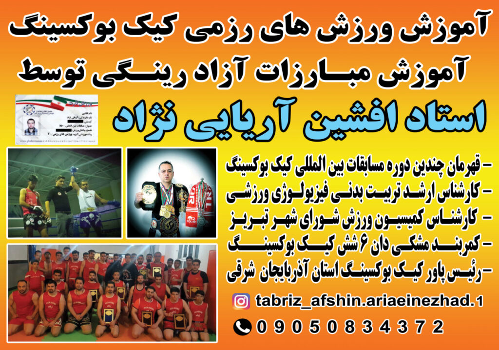 آموزش کیک بوکسینگ در تبریز توسط استاد افشین آریایی نژاد قهرمان چندین دوره مسابقات بین المللی رئیس سبک پاور کیک بوکسینگ استان آذربایجان شرقی (کارشناس ارشد تربیت بدنی فیزیولوژی) کارشناس کمیسیون ورزش شورای شهر تبریز کمربند مشکی دان ۶کیک بوکسینگ آموزش مبارزات آزاد رینگی در تمامی رده های سنی آموزش خصوصی و عمومی بدون محدودیت سنی